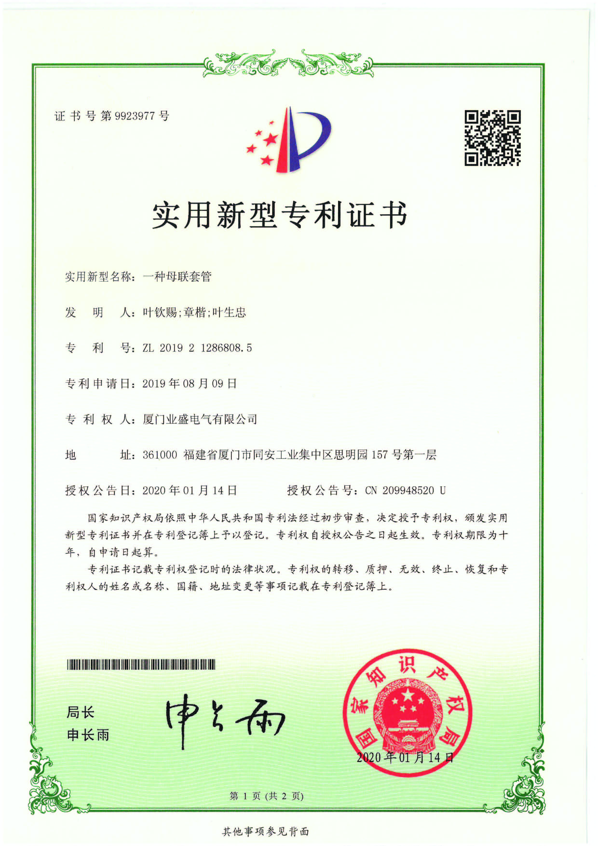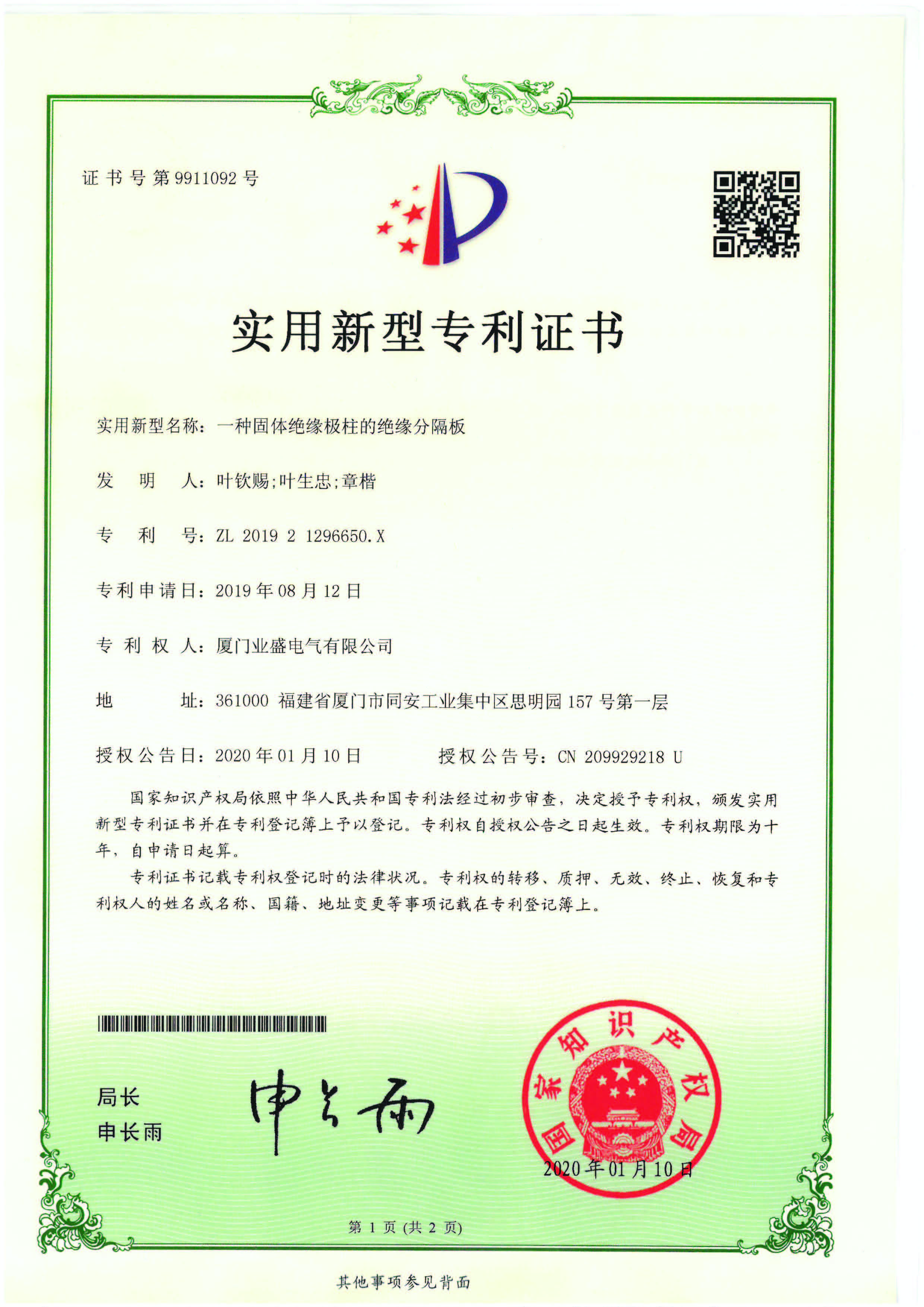 實用新型專利證書